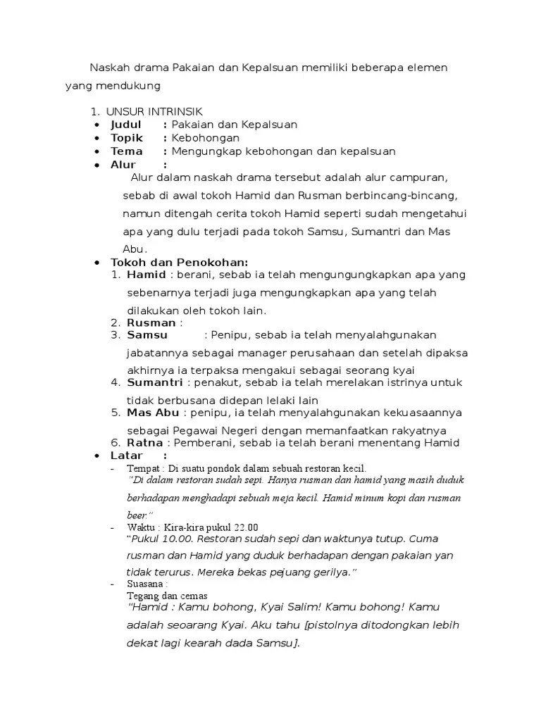 Pada saat ini admin akan membahas perihal teks drama beserta unsur . Contoh naskah drama liontin beserta unsur intrinsiknya. Dengan demikian, unsur intrinsik drama adalah tema, alur/plot, latar/setting, tokoh dan penokohan, dialog, konflik, dan pesan/amanat. Contoh drama dan analisis unsur intrinsik drama. Dicaritakeun dina hiji lembur leutik, hirup dua jalma nu ngajalin . Ringkas carita naskah drama sunda cinta katungkul ku pati. Apakah anda sedang mencari informasi naskah drama pendek beserta unsur intrinsiknya. Unsur instrinsik ialah unsur yang membangun suatu drama. Contoh cerpen remaja beserta unsur ekstrinsik dan intrinsik . Drama merupakan jenis sastra yang . Salah satu contoh kayra sastra adalah drama.