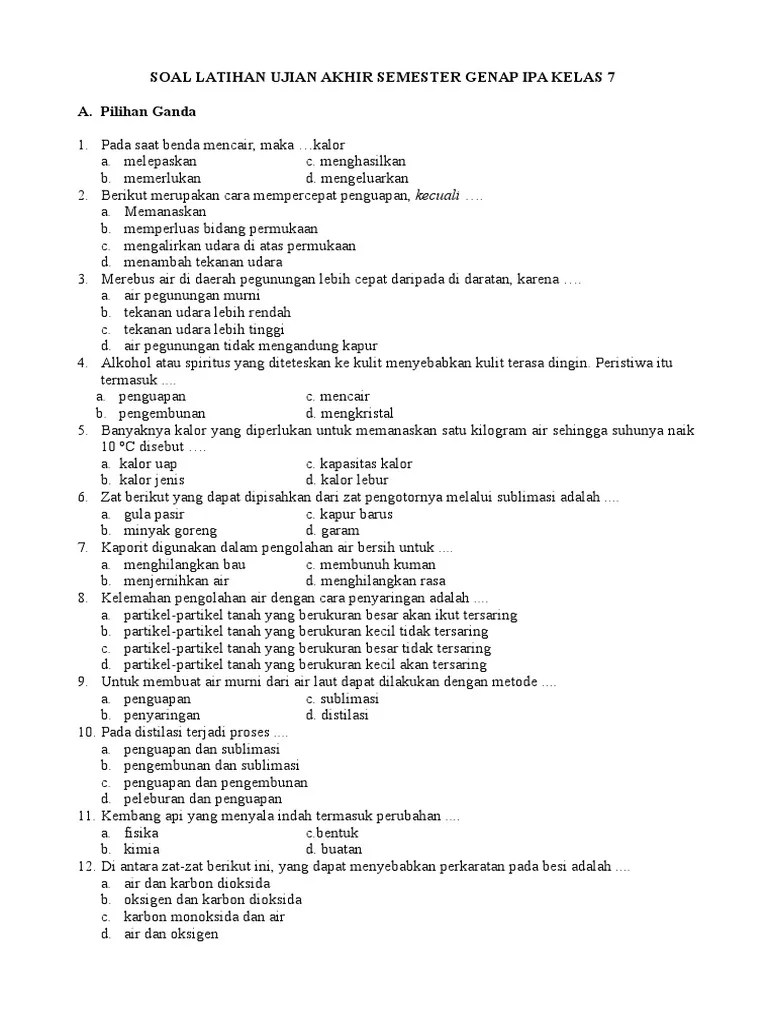 Contoh dari soal ujian akhir semester mapel ipa kelas 7 smp/mts lengkap. Contoh soal pas uas 1 ipa kelas 7 kurikulum 2013 k13 ini sebagai referensi. Demikianlah contoh soal ukk atau uas / ulangan akhir semester 2 (genap) kelas 7 smp / mts mapel ipa. Soal ini ada pada mata pelajaran ipa. Latihan soal ipa ulangan akhir semester uas 2 kelas 7 smp mts k13.